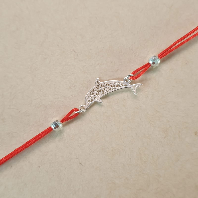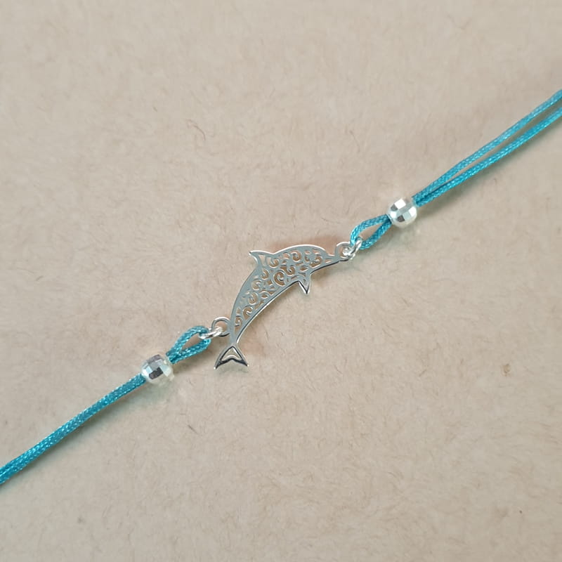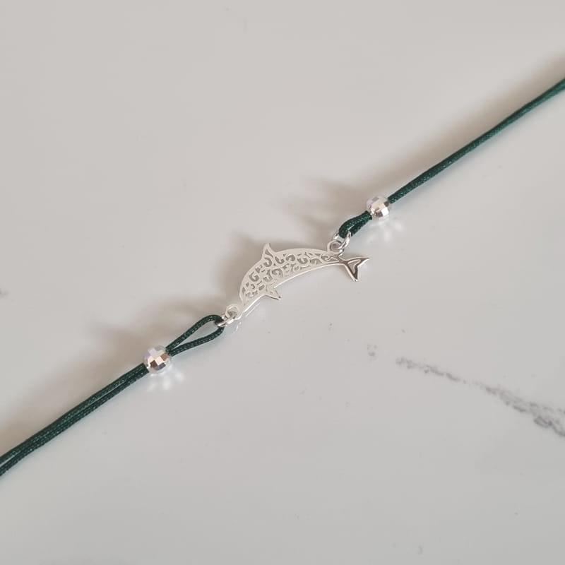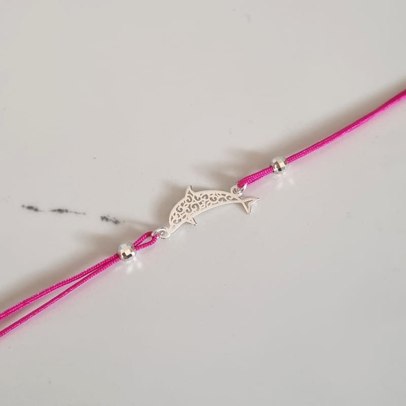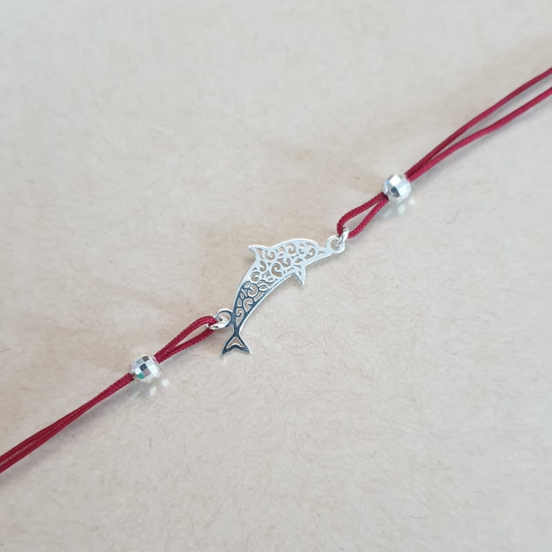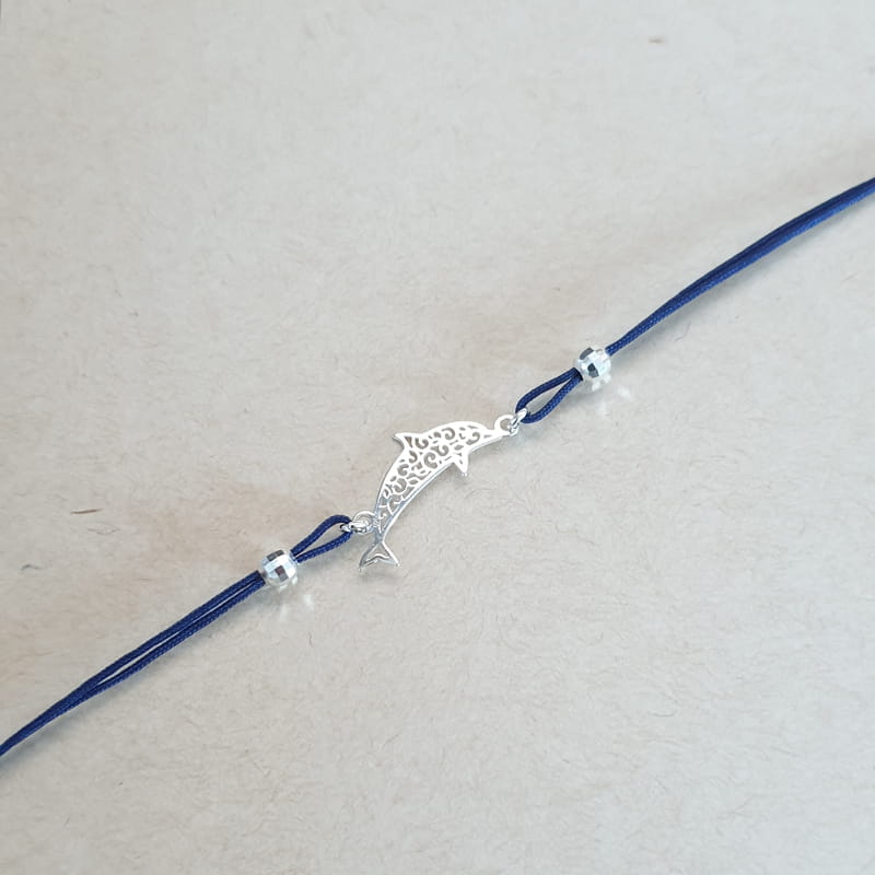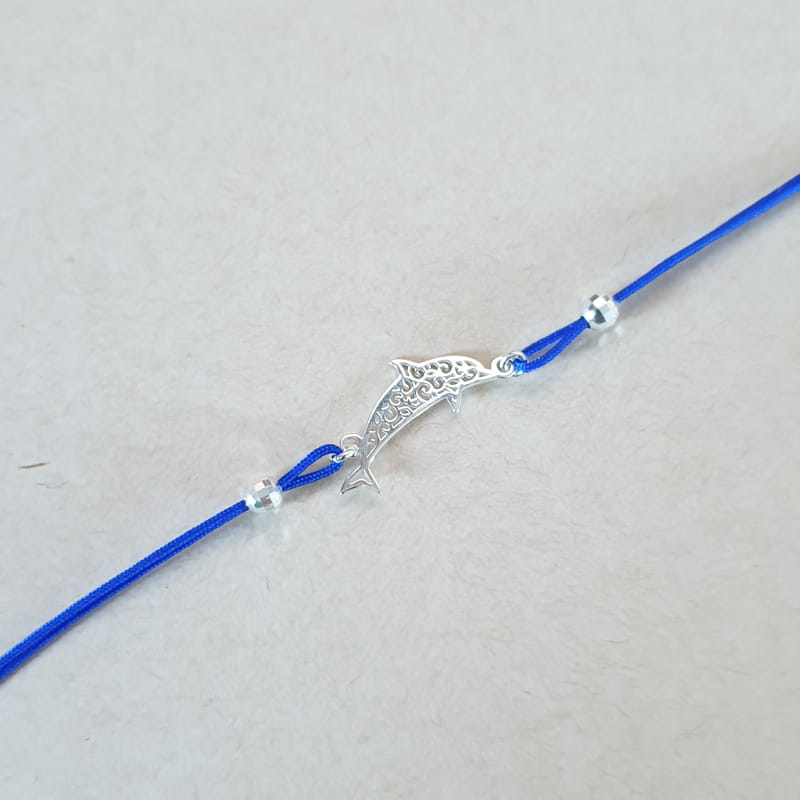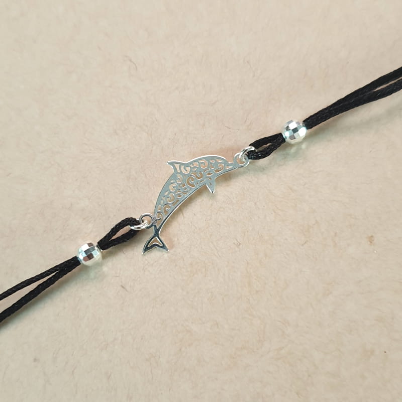Bransoletka wykonana ze sznurka i srebra, sznureczek ozdobiony kuleczkami i ażurowym delfinem.