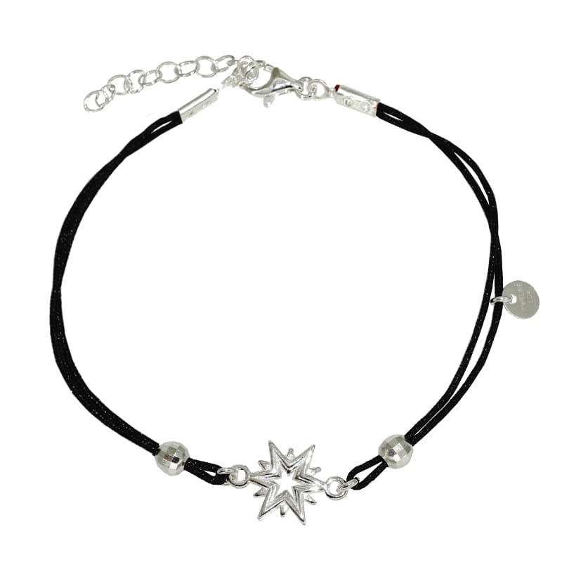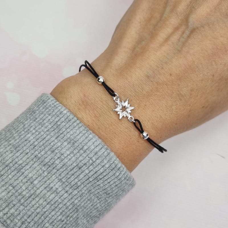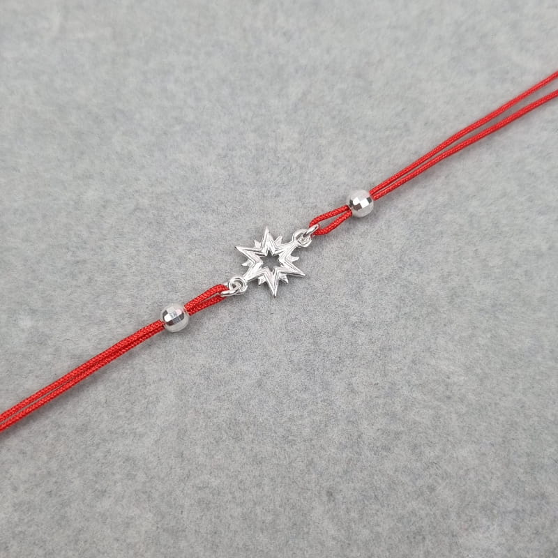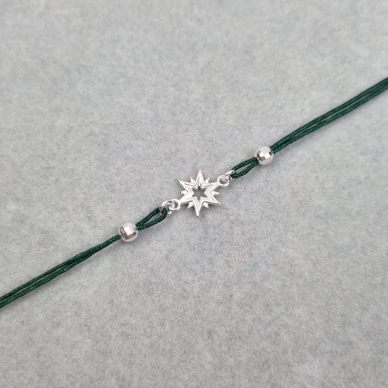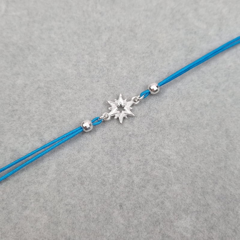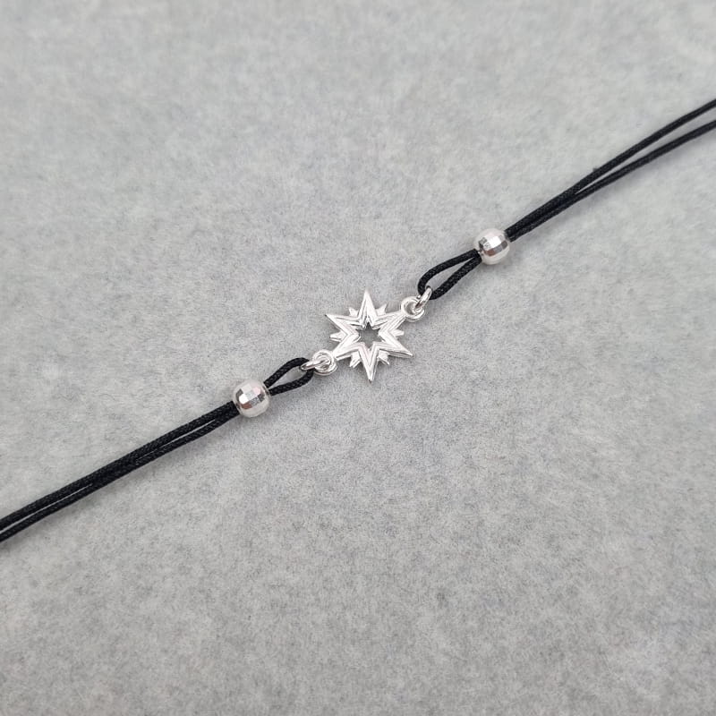 Bransoletka wykonana ze sznurka i srebra, sznureczek ozdobiony kuleczkami i gwiazdką.