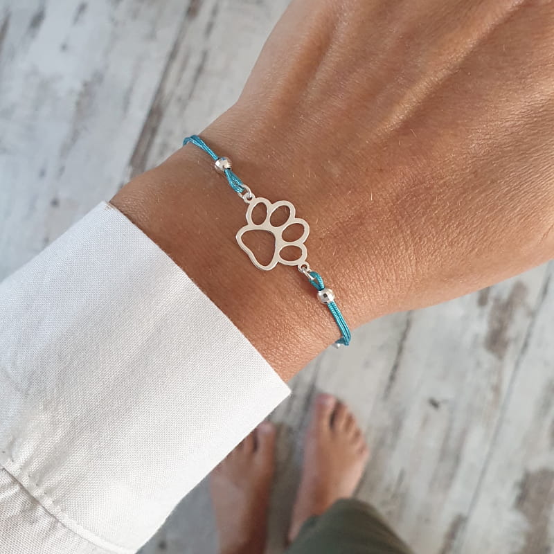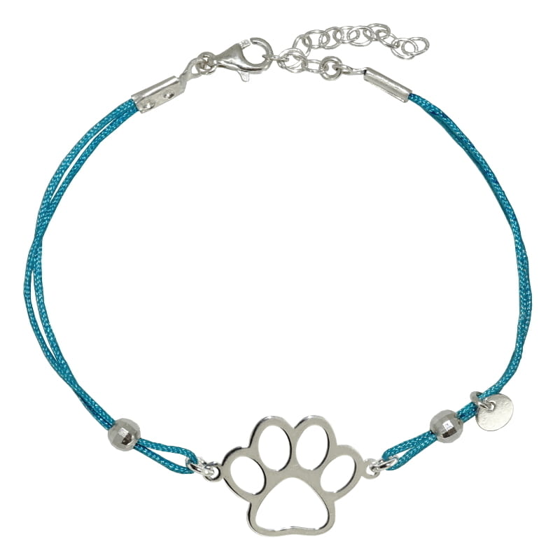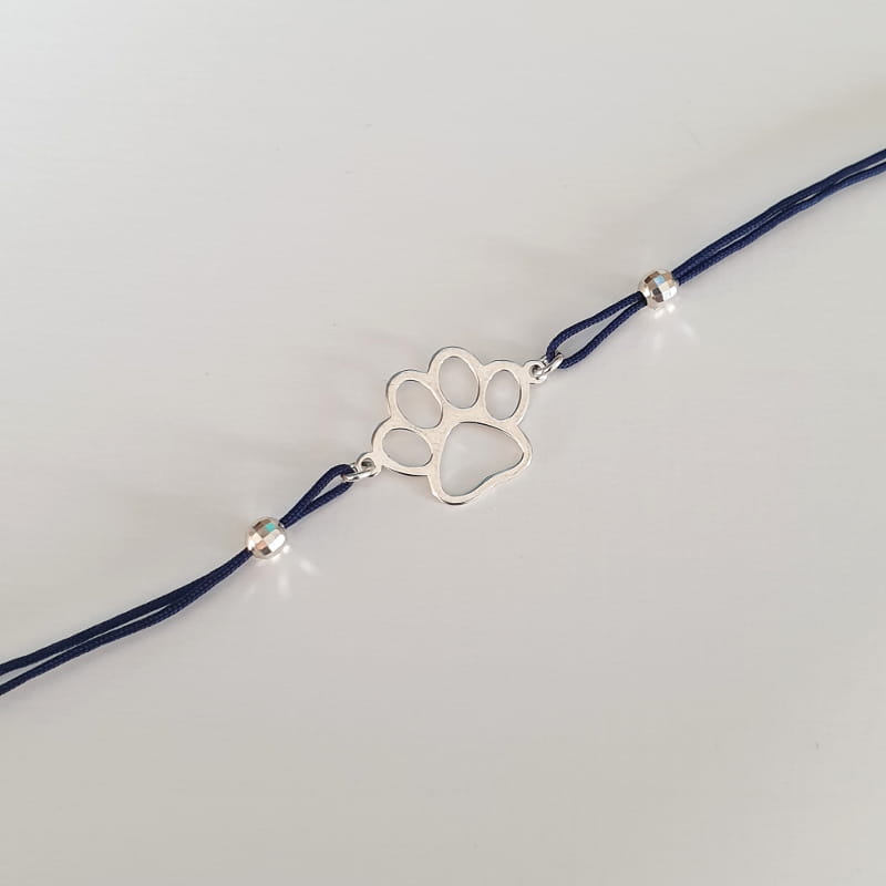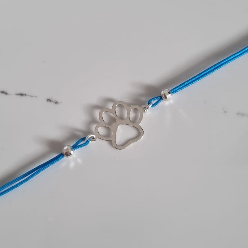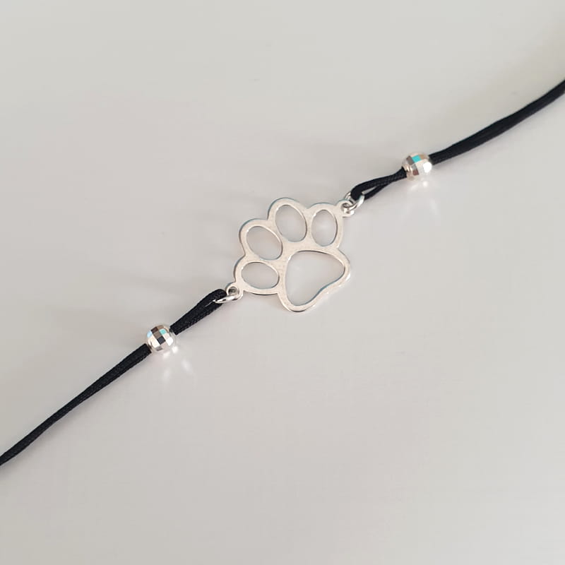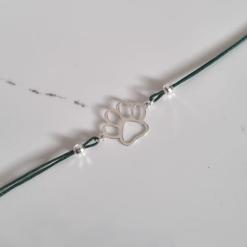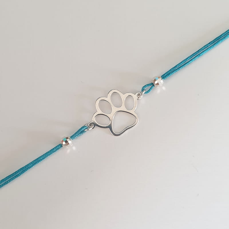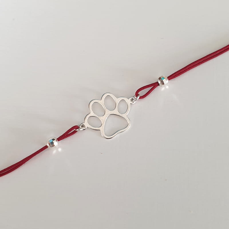 Bransoletka wykonana ze sznurka i srebra, sznureczek ozdobiony kuleczkami i łapą.
