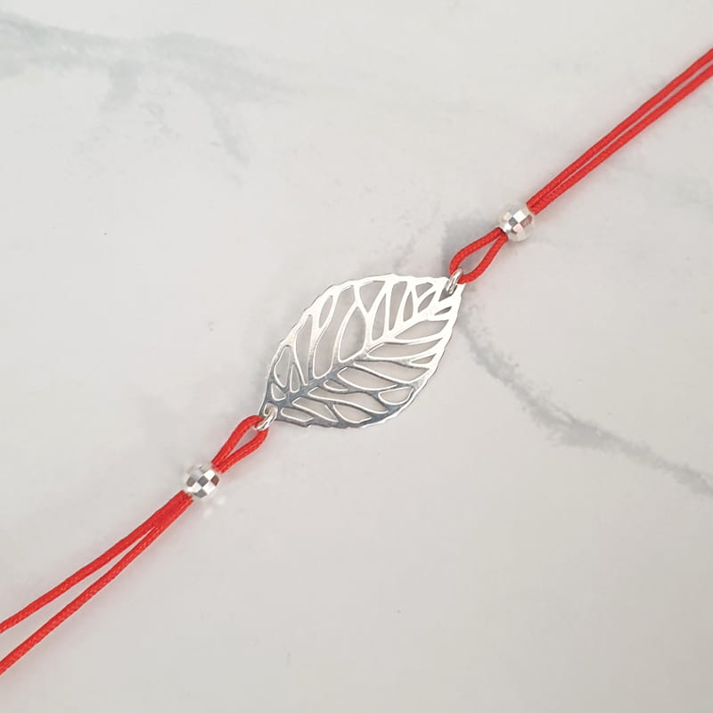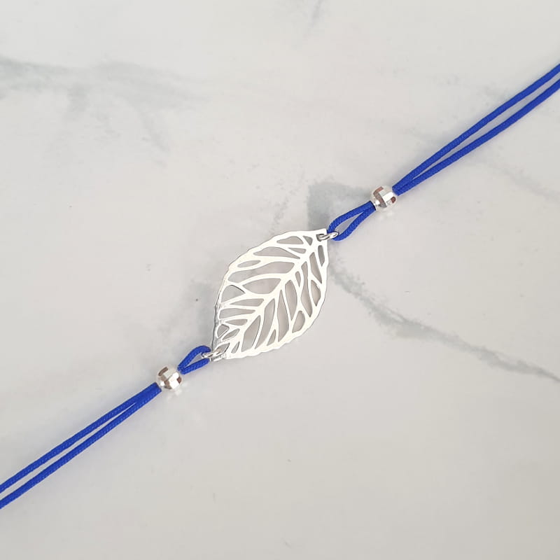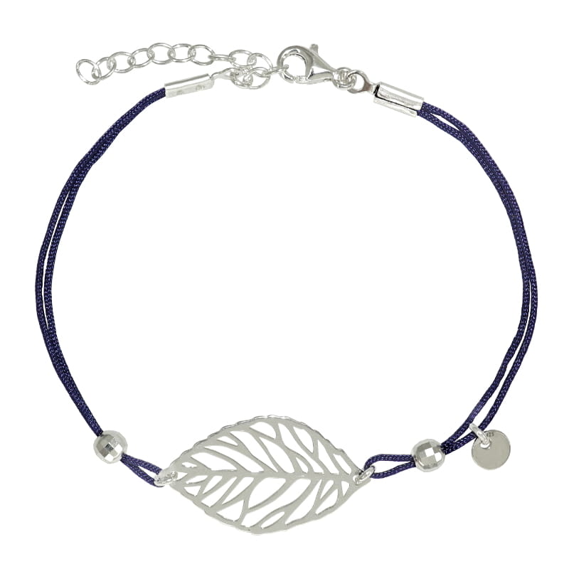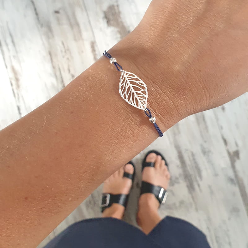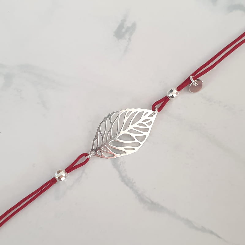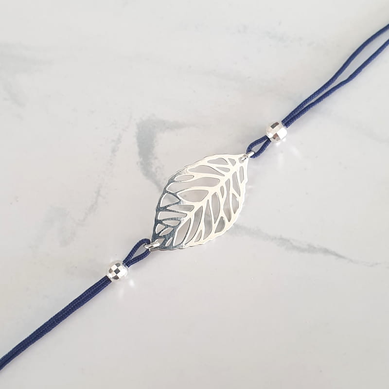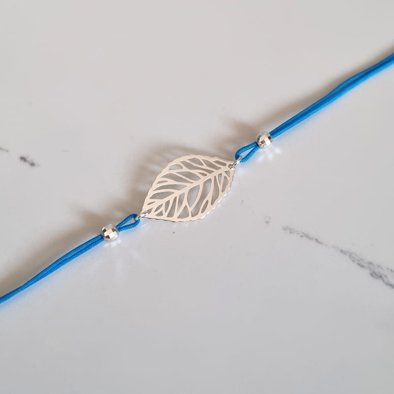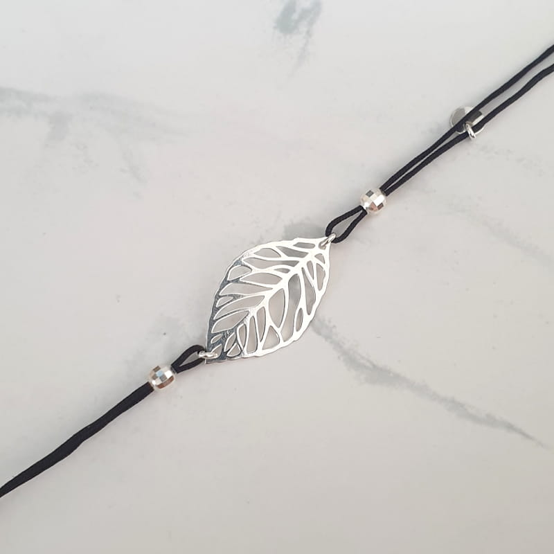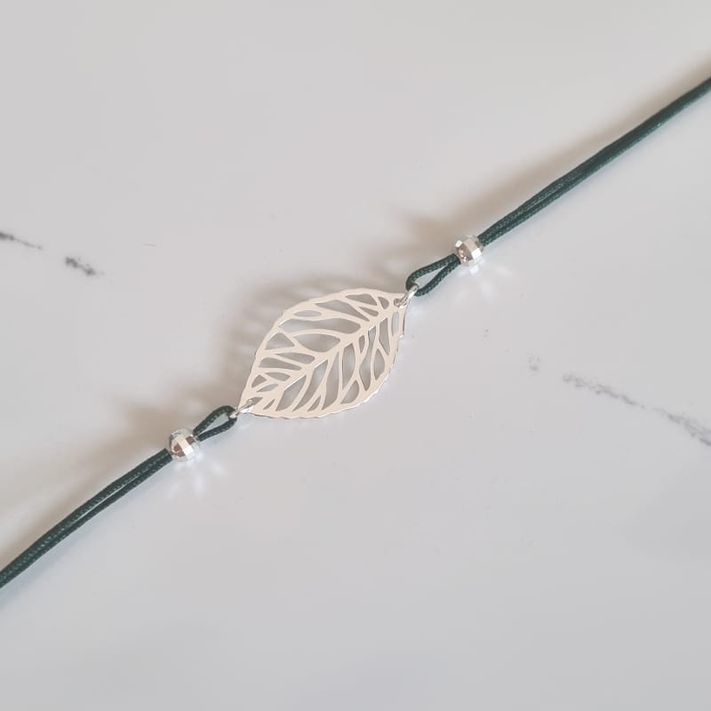 Bransoletka wykonana ze sznurka i srebra, sznureczek ozdobiony kuleczkami i ślicznym ażurowym liściem.