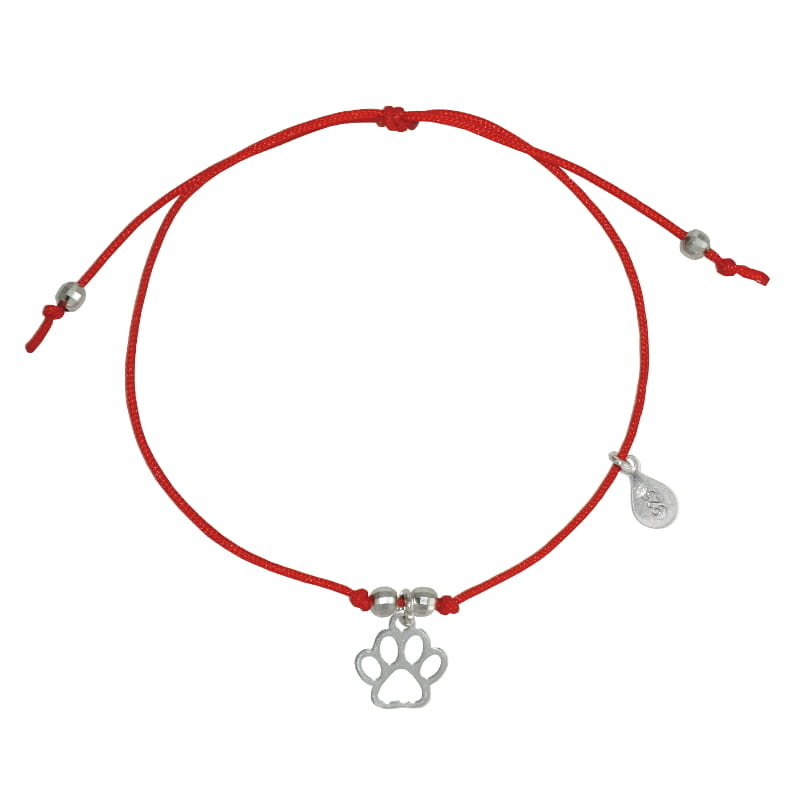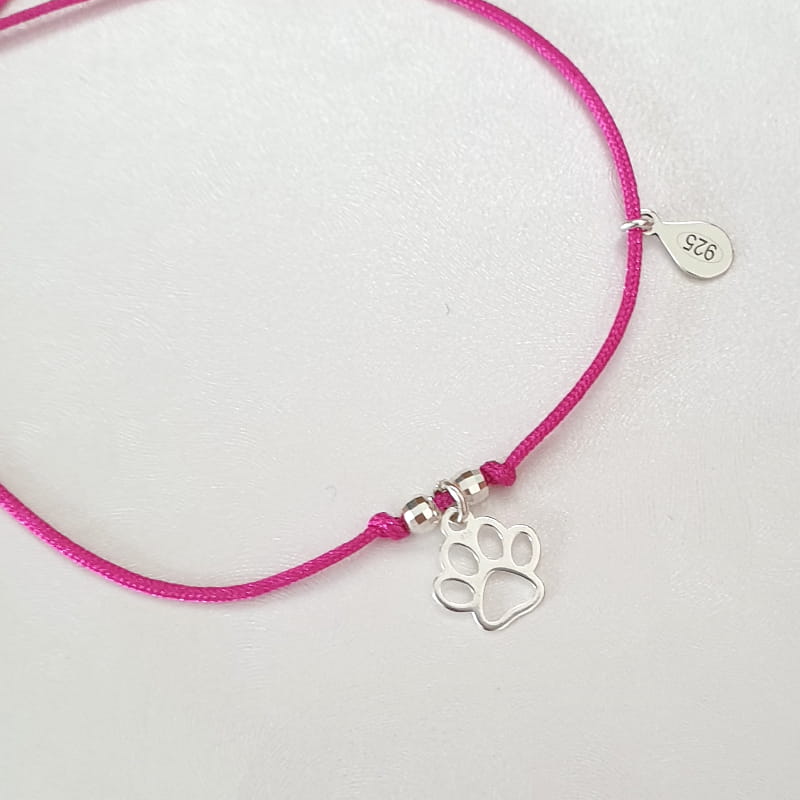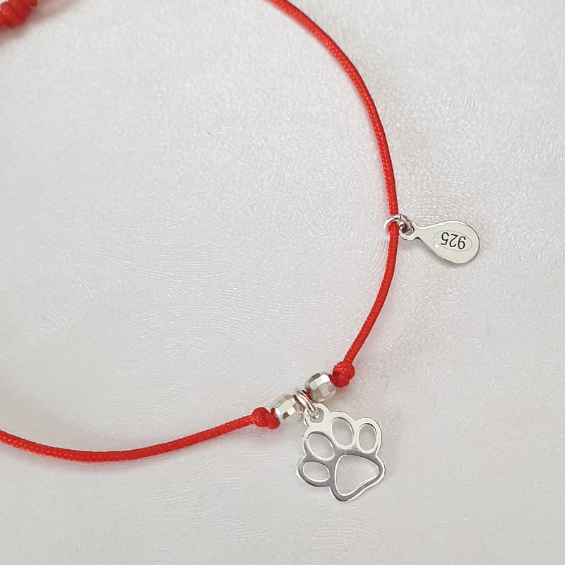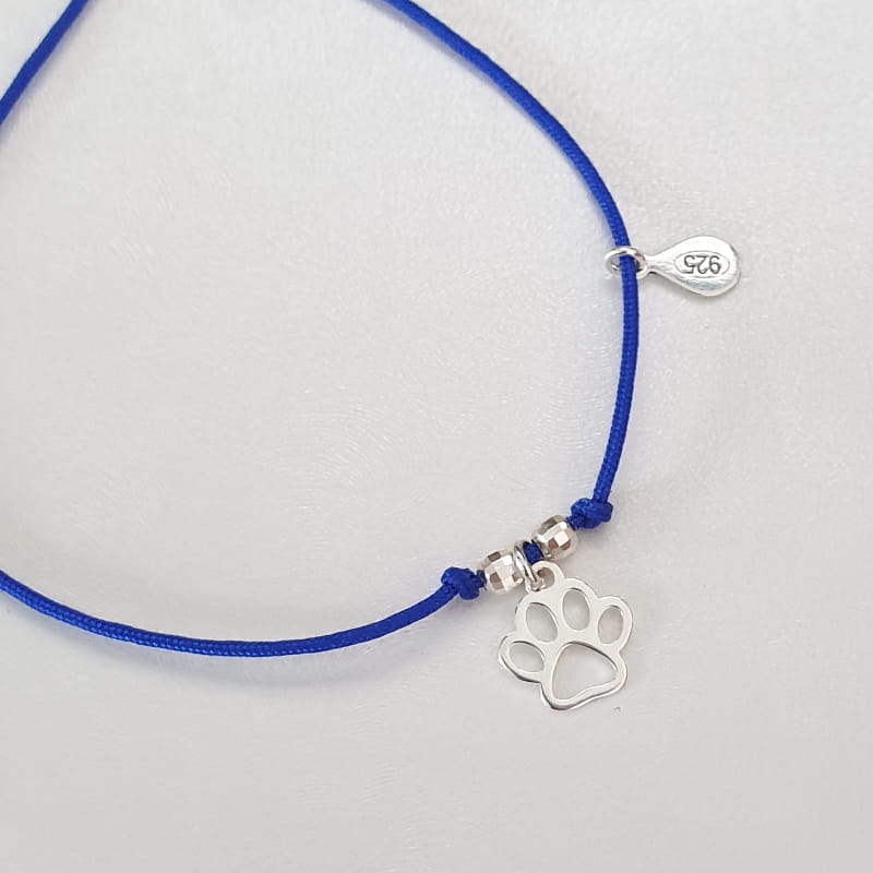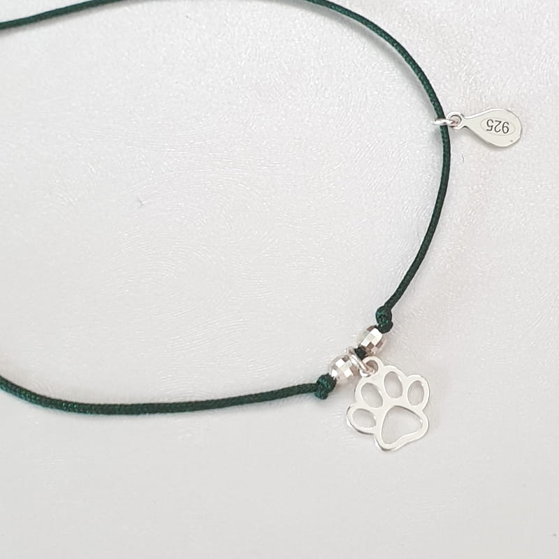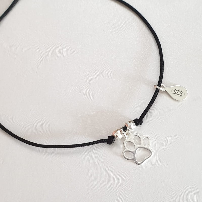 Bransoletka wykonana ze sznurka i srebra, sznureczek ozdobiony kuleczkami i delikatną łapka pupila.