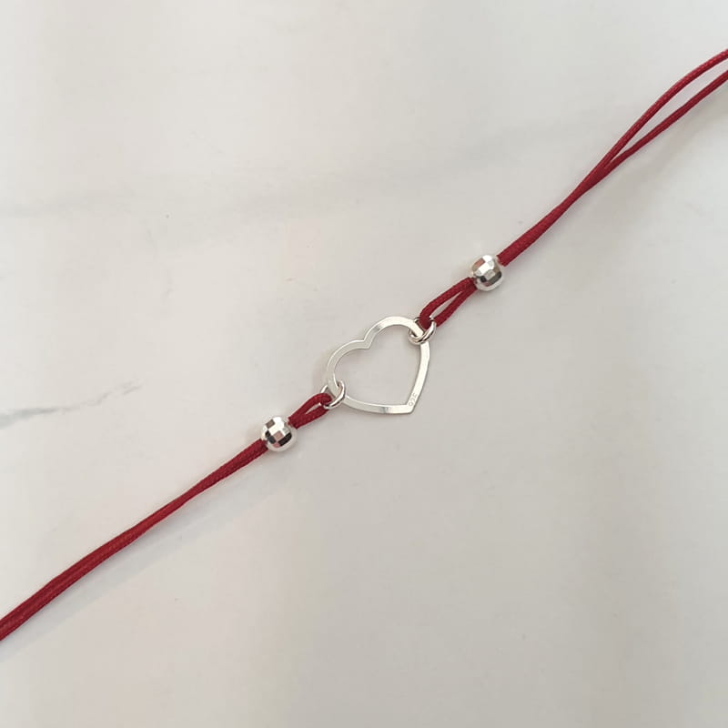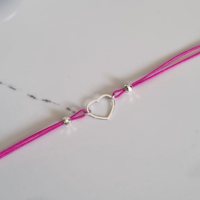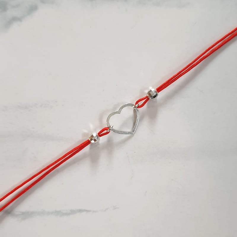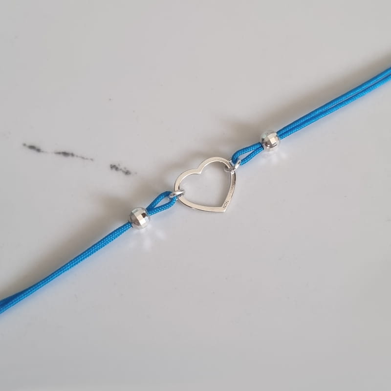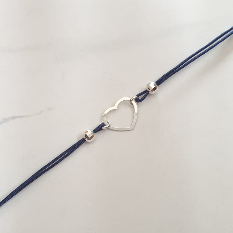 Bransoletka wykonana ze sznurka i srebra, sznureczek ozdobiony kuleczkami i ślicznym, delikatnym konturem serca.