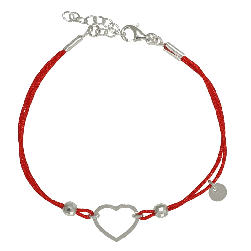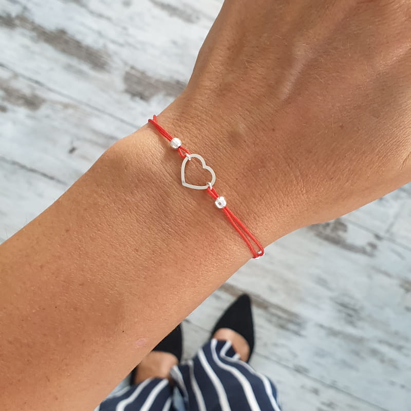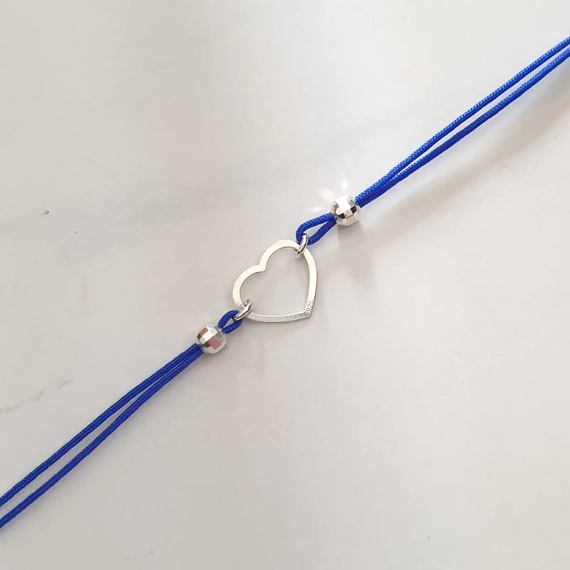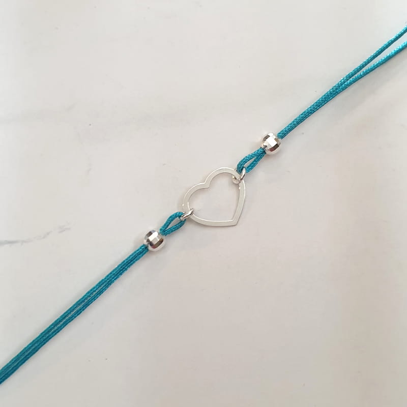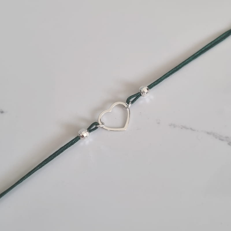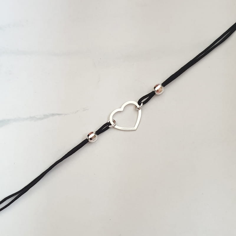 Bransoletka wykonana ze sznurka i srebra, sznureczek ozdobiony kuleczkami i ślicznym, delikatnym konturem serca.