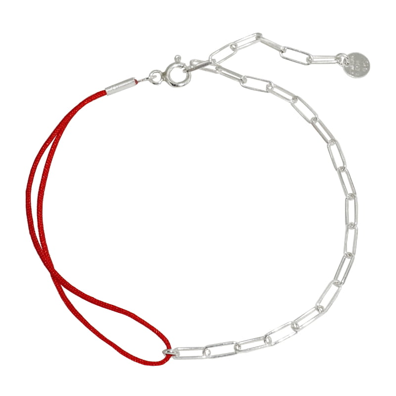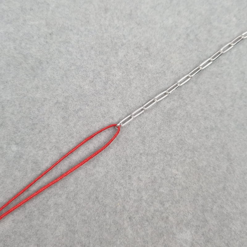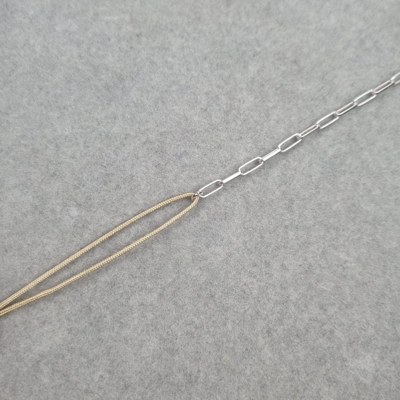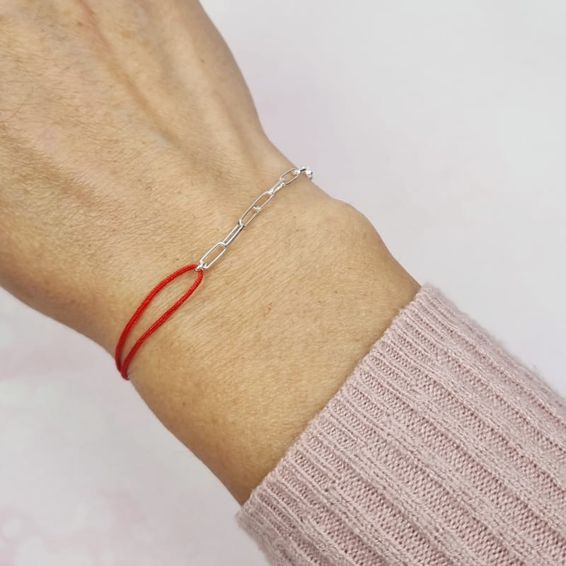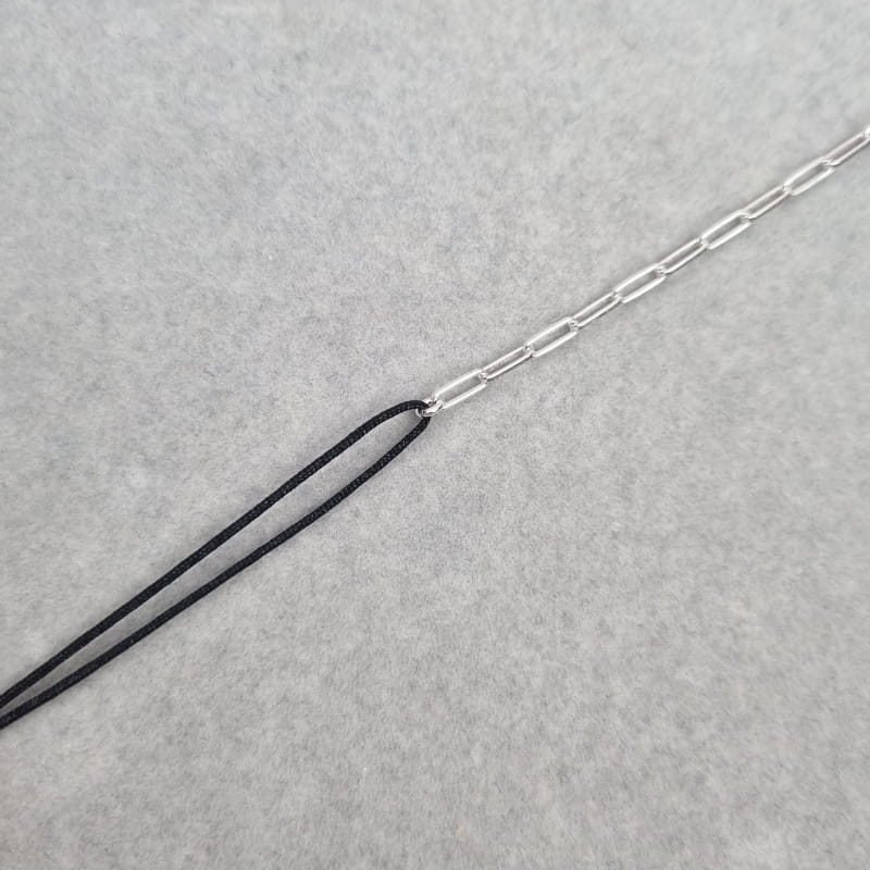 Bransoletka wykonana ze sznurka i srebrnego łańcuszka wykonanego z podłużnych ogniw.