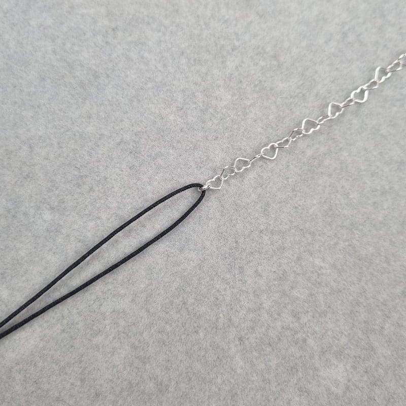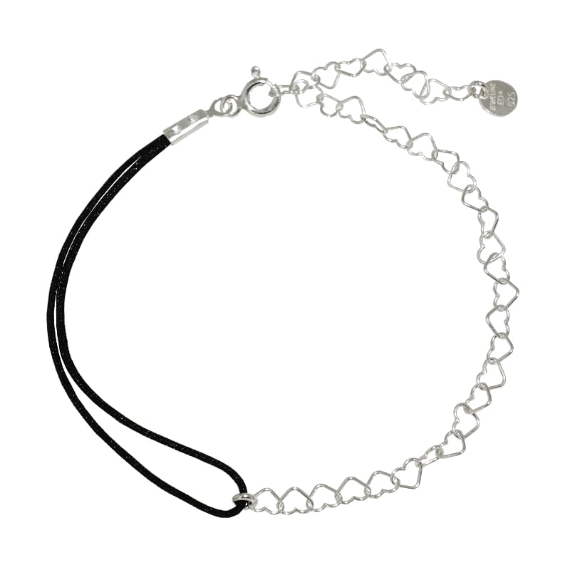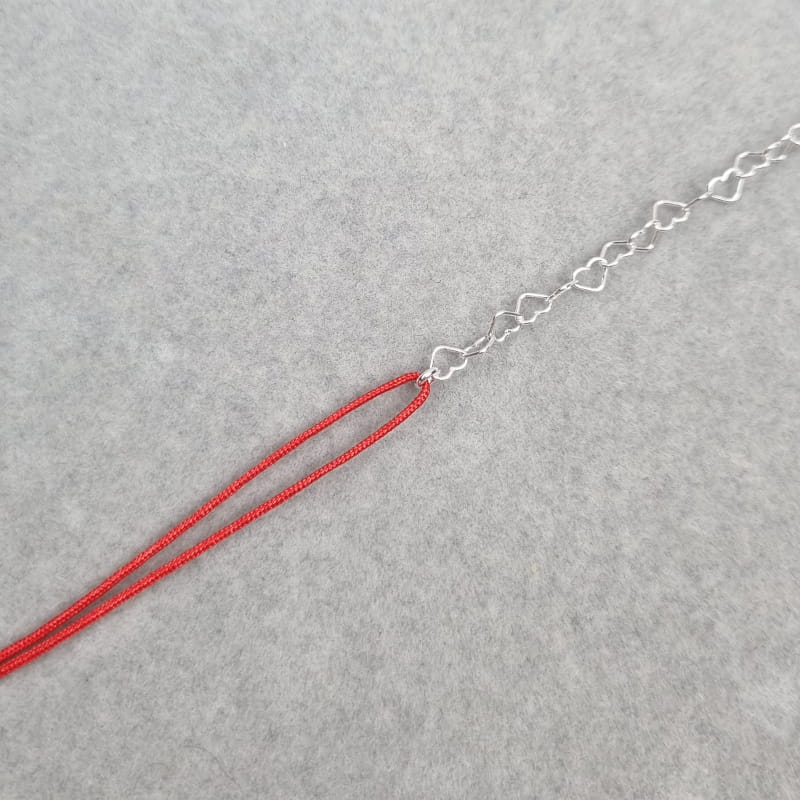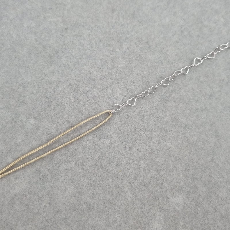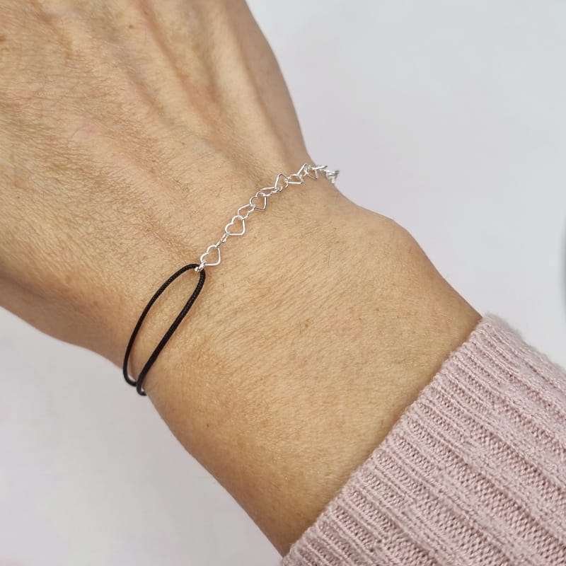 Bransoletka wykonana ze sznurka i srebrnego łańcuszka wykonanego z malutkich serduszek.
