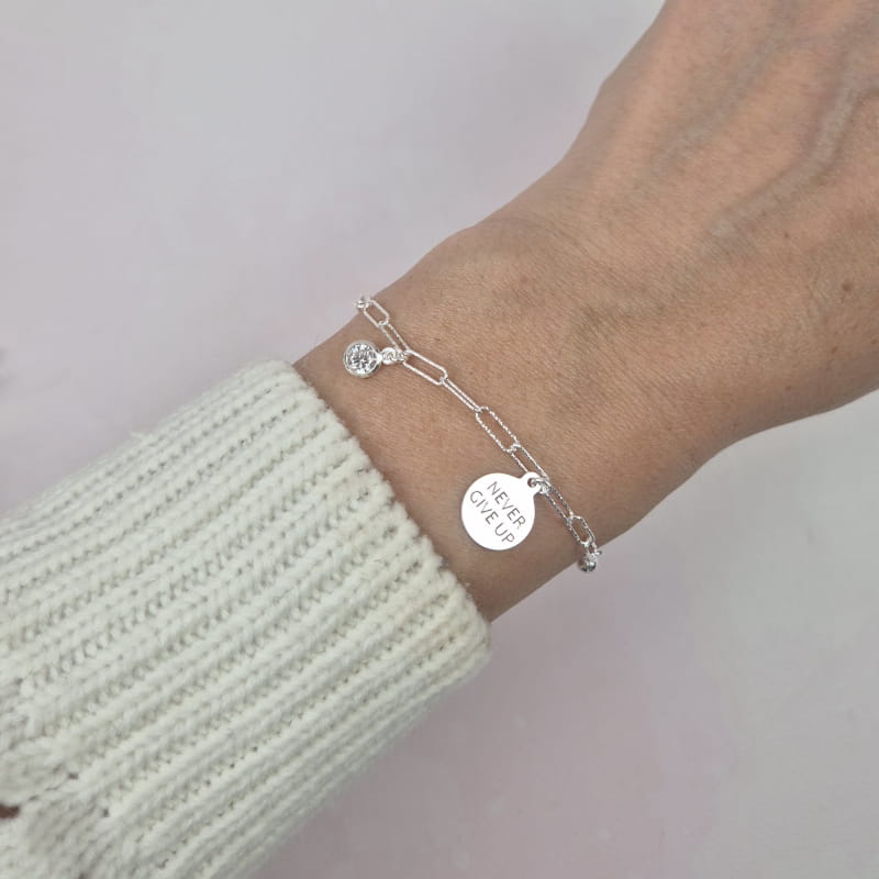 Dodaj wyjątkowy akcent do swojej biżuterii dzięki tej eleganckiej bransoletce ze srebra próby 925, która łączy klasyczny styl z inspirującym przesłaniem. Delikatny łańcuszek o ogniwkach w formie prostokątów zdobią trzy zawieszki: