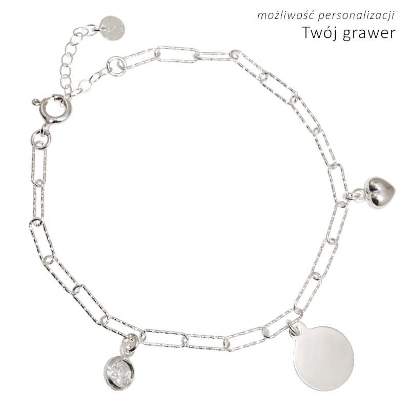 Bransoletka srebrna Blaszka Twój grawer, cyrkonia i serce