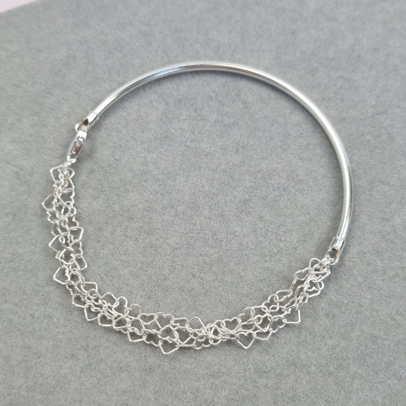 Bransoletka łącząca srebrną rureczką i trzy łańcuszki z ogniwami w kształcie małych serduszek. Bransoletka będzie idealnym prezentem dla bliskiej Ci osoby.