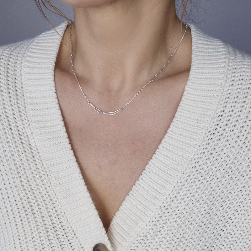 Naszyjnik z ciekawym połączeniem dwóch rodzajów łańcuszka i wykonaniem ze srebra próby 925 gwarantuje trwałość i ponadczasowy blask. To doskonały wybór dla kobiet, które cenią eleganckie dodatki podkreślające indywidualny styl.