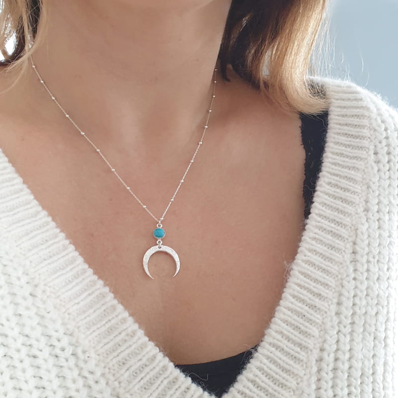 Piękny naszyjnik wykonany z łańcuszka ozdobionego kuleczkami i małego turkusu w srebrnej oprawie oraz księżyca.
