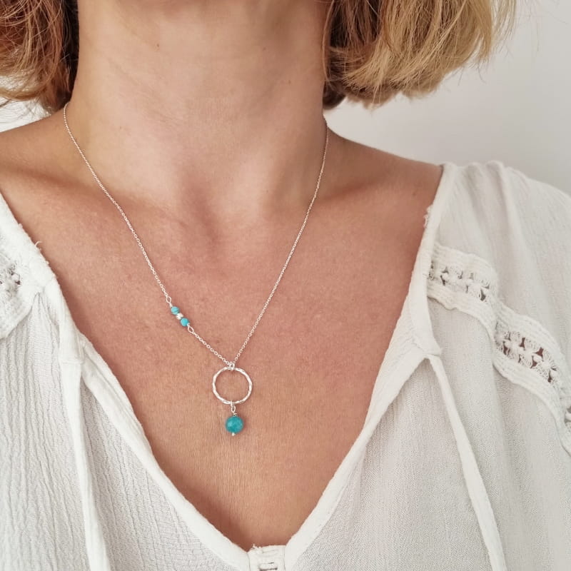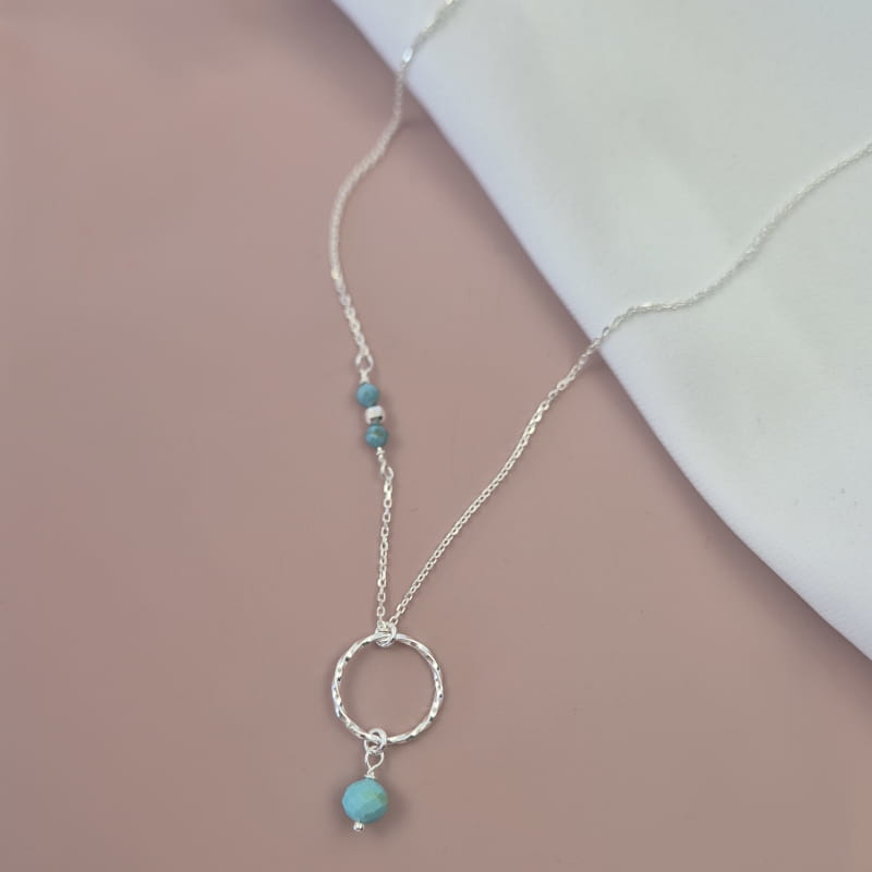 Naszyjnik z kamieniami naturalnymi. Łańcuszek ozdobiony wstawką wykonaną ze srebrnej kuleczki i dwóch kamyczków z magnezytu, na którym zawieszone jest błyszczące kółeczko z niebieskim amazonitem.