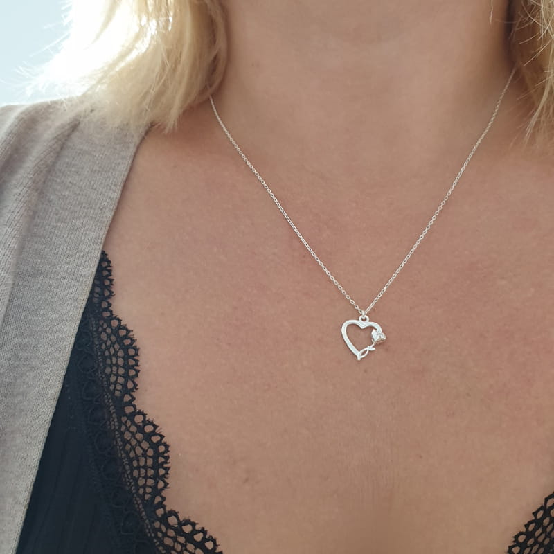 Naszyjnik z zawieszką, ślicznym serduszkiem ozdobionym różą. Pięknie podkreśli Twoje uczucia.