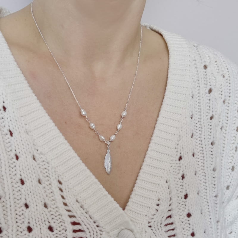Wyjątkowy naszyjnik z naturalnymi perłami oraz pięknym, srebrnym piórkiem.