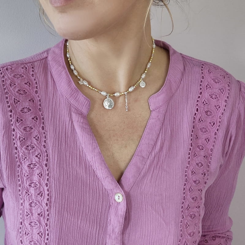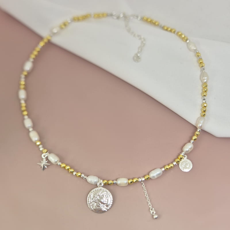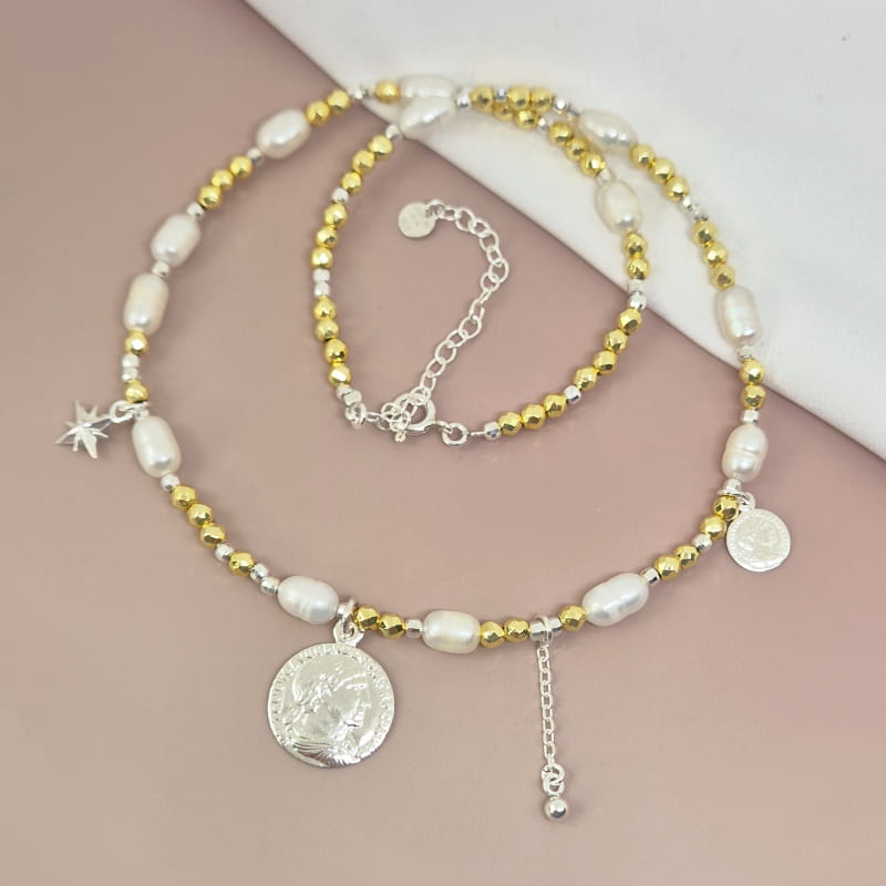 Wyjątkowy naszyjnik wykonany z pereł naturalnych, złotych hematytów i srebrnych kuleczek, na którym podwieszone są blaszki - monety, srebrna gwiazdka oraz kuleczka na łańcuszku. Dzięki regulacji zapniesz naszyjnik na odpowiedniej dla siebie długości.